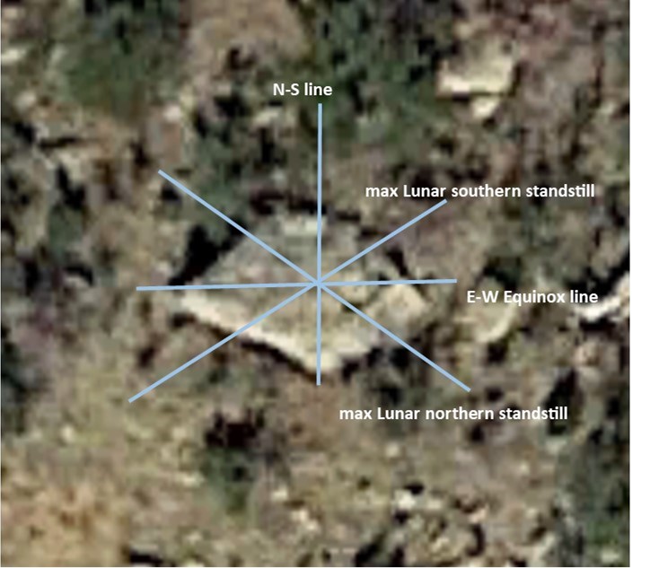 Hole alignments on flat stone tables sometimes are solar and lunar calendars (and unknown alignments). Below is a rock table with both solar (summer solstice, winter solstice, equinox) and lunar (northern and southern turning points) hole alignments with each calendar center point off set from each other. Often there are human or animal likenesses nearby.