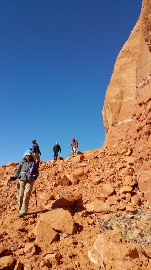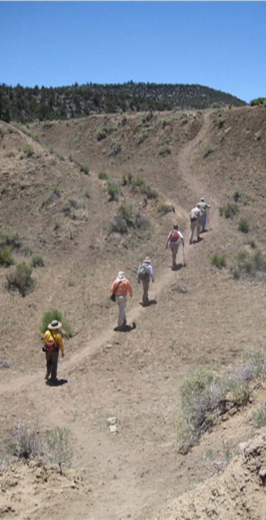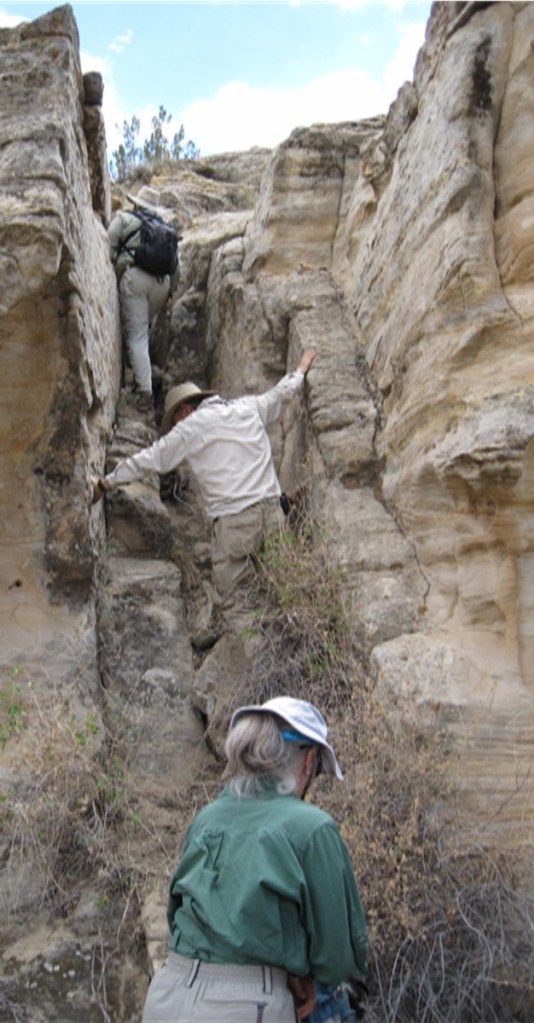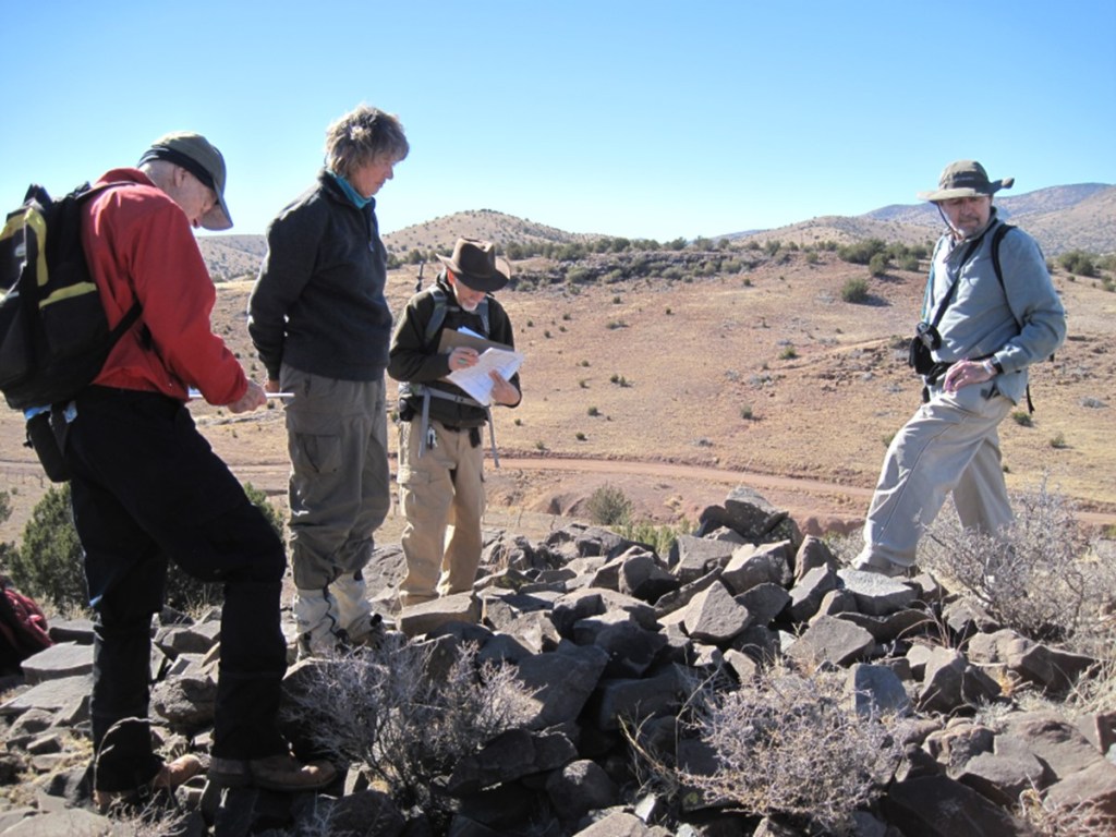 Members of the Albuquerque Archaeologic Society volunteered on rock art recording projects since 1967 including at Comanche Gap and the Petroglyph National Monument. Over the years, the various teams recorded and documented sites around central New Mexico. In 2009 an AAS group teamed with the Bureau of Land Management (BLM) to record rock art on BLM public lands. Team members were classified as BLM volunteers and completed standard BLM employee training classes including outdoor first aid, radio operations, government vehicle driver training. The team worked within the BLM Rio Puerco, Socorro, and Farmington Field Office Districts. Pre-covid pandemic, the crew recorded at sites every week, weather permitting, year-round. As the photos below illustrate, crew members were experienced hikers. The AAS-BLM team remained about the same size as team members retired or moved away from this area new members were recruited.